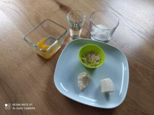 - Wszystkie składniki odważyć i dokładnie z dobą wymieszać (banana rozetrzeć na masę)