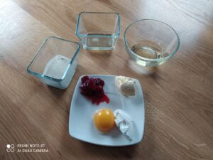 Składniki odważyć, rozdrobnić wiśnie, a następnie wszystko dokładnie wymieszać