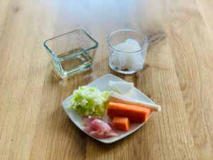- Warzywa umyć, obrać i osuszyć. Mięso i warzywa po odważeniu pokroić na mniejsze kawałki