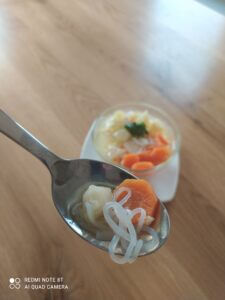 - Do małego garnka wrzucić mięso i pokrojone warzywa. Zalać zimną wodą i gotować na delikatnym płomieniu przez około 20-30 min Kiedy warzywa będą miękkie dodać makaron i olej. Całość gotować jeszcze 5 minut.